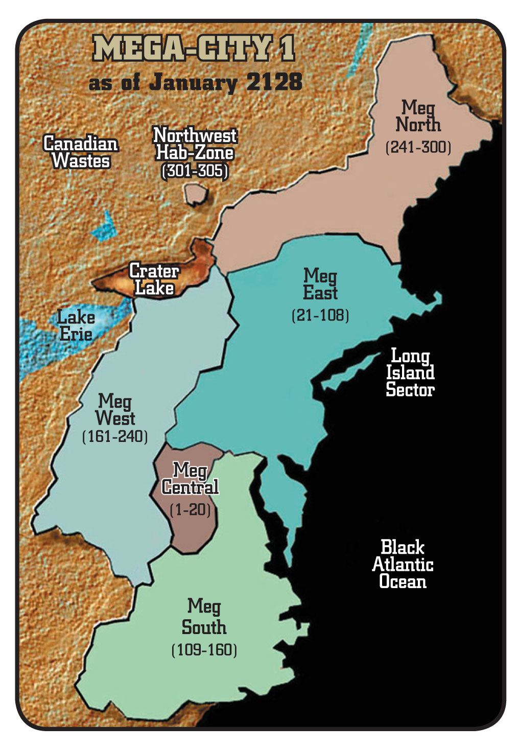 Sector 26 - Boris Karloff Conapts (post-a), Cybo-Comp HQ, Hillcrest Rise Luxy-Estate (post-a), Larry Hagman Conapts (post-a, d. 2105), The Megalopolis.
